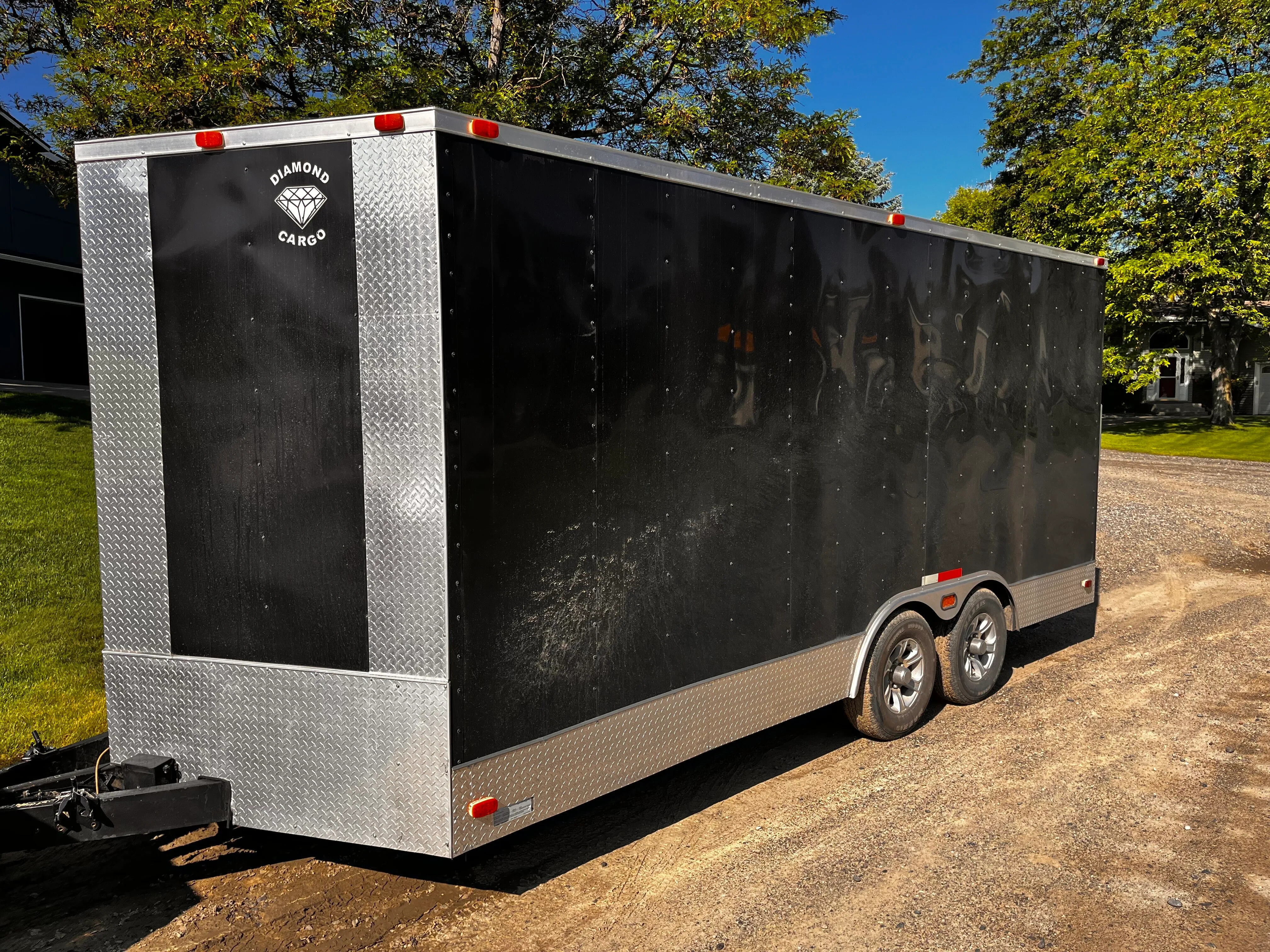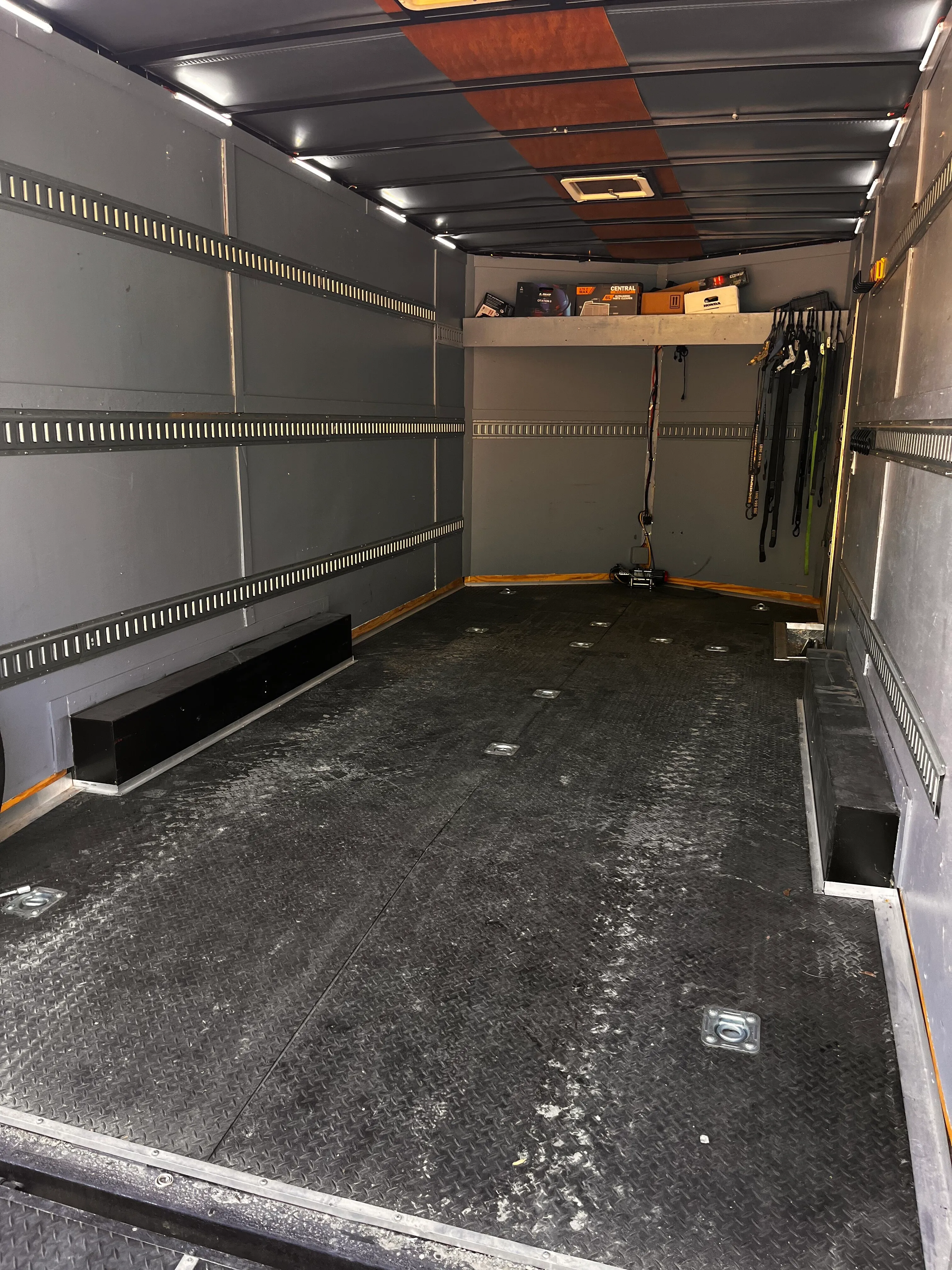 8.5 by 16 Enclosed Cargo trailer with extra height and ramp door. 10,000lb capacity. Loaded with E-Track, 5,000lb winch, D-Rings. Includes 4 ratchet tie downs, and E-Track accessories.